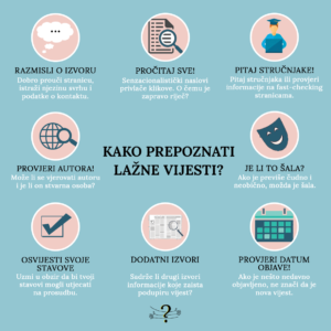 Gotovo svatko od nas nekad je „nasjeo“ na lažnu vijest – one su dizajnirane tako da privuku našu pažnju i iskoriste načine na koje naš mozak funkcionira kako bi promovirale stavove ili ciljeve svojih autora. Stoga je sasvim prirodno ako ne pristupimo baš svakoj vijesti s povećalom. Ipak, u svrhu sprječavanja širenja potencijalno opasnih dezinformacija važno je njegovati kritičko mišljenje i osvijestiti da možemo odgovornije pristupati sadržaju koji dijelimo na društvenim mrežama.
