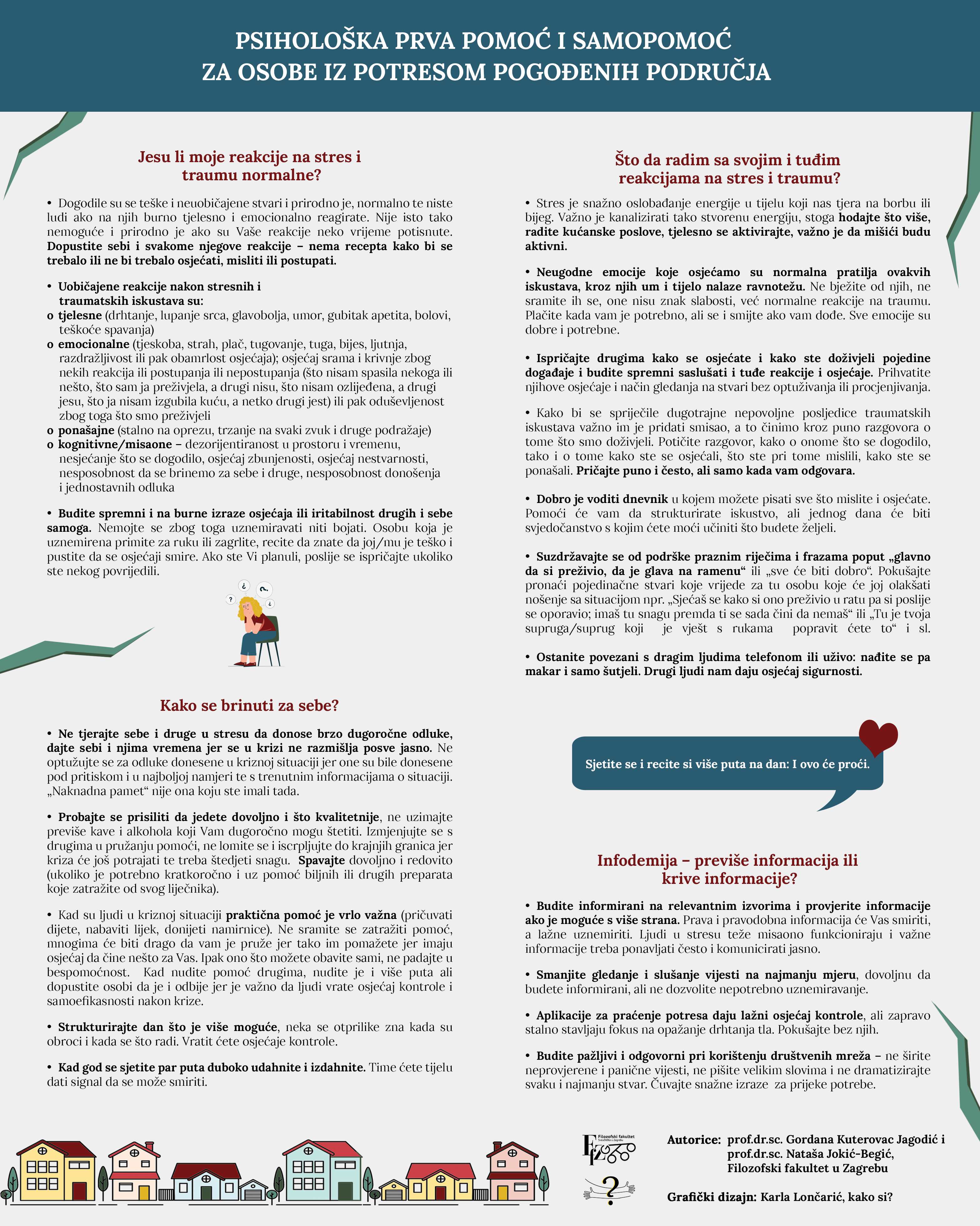 Profesorice psihologije s našeg matičnog odsjeka pripremile su letak za pružanje psihološke prve pomoći i samopomoći osobama koje su doživjele potres. Letak sadrži psihoedukativni dio o uobičajenim reakcijama nakon potresa, smjernice za brigu o sebi i drugima te savjete za nošenje sa simptomima akutne stresne reakcije. Ovdje su na jednom mjestu sažete najvažnije informacije koje vam mogu biti korisne ako ste doživjeli potres.