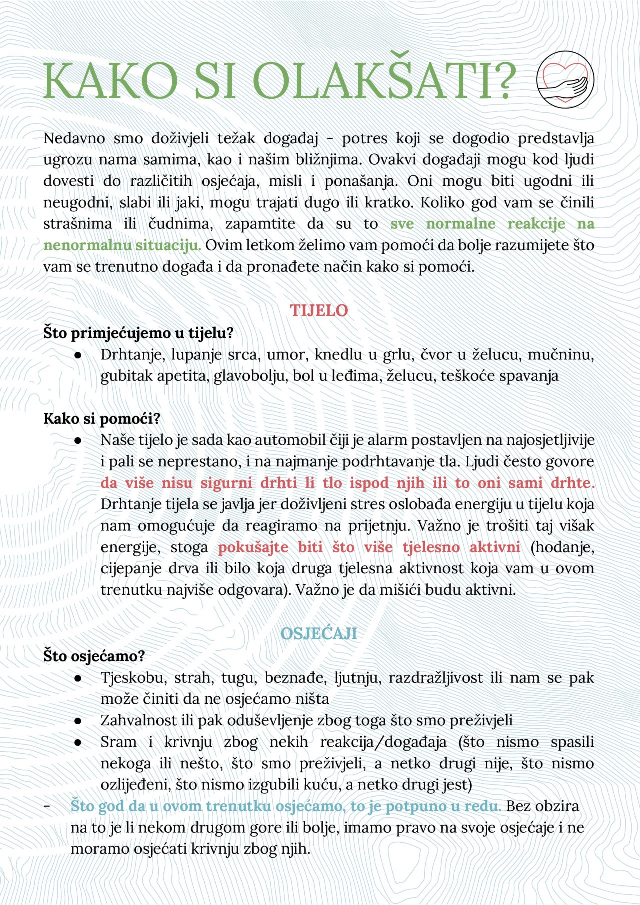 Psihologinje Anamarija Lonza i Iva Vukojević stvorile su letak za psihološku prvu pomoć ljudima pogođenima potresom, a posebno onima s Banije. Ovaj stručan, konkretan i praktičan letak može vam pomoći da razumijete svoje trenutne osjećaje, misli, tjelesne senzacije i ponašanja, a nudi i smjernice što učiniti da si olakšate. Posebno nas veseli činjenica što su educirani stručnjaci i volonteri ovaj letak organizirano dijelili na terenu.
